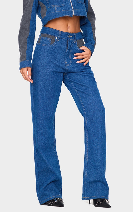 Dark Blue And Black Contrast Panel Wide Leg Jeans