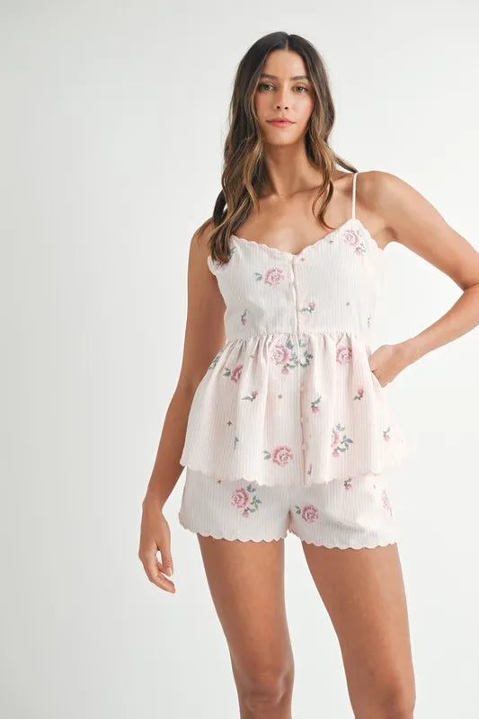 MABLE Stripe Embroidered Peplum Cami and Shorts Set