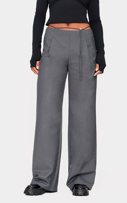 Charcoal Woven Low Rise Thin Belt Detail Straight Leg Trousers