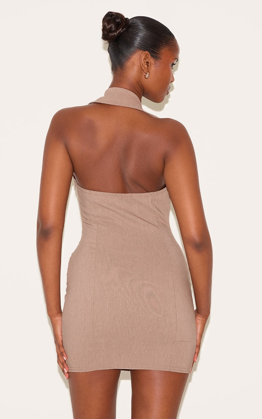 Taupe Asymmetric Button Down Collar Detail Bodycon Dress