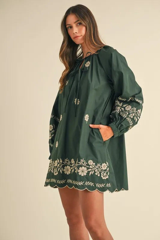 MABLE Embroidered Long Sleeve Peasant Mini Dress