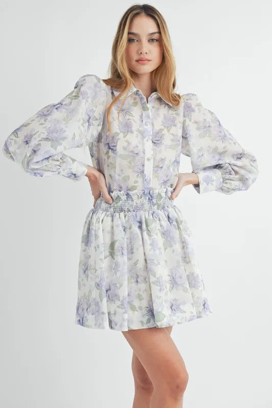 MABLE Floral Print Button Down Blouse and Mini Skirt Set