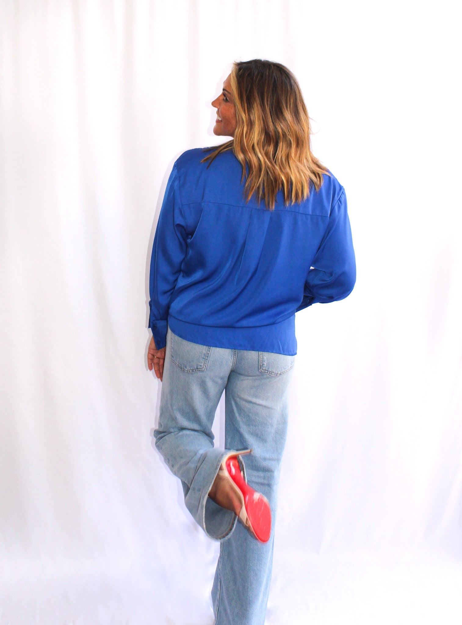 Upgrade your wardrobe with The Ashley Collared Button Down Tunic Shirt. This versatile shirt, shown here styled in 3 different ways, available in vivid colors, combines the sophistication of a collared shirt with the luxurious feel of satin. From day to night, this shirt will elevate your style.